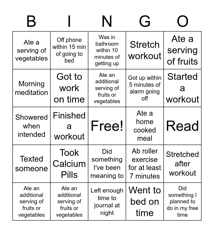 This bingo card has a free space and 24 words: Took Calcium Pills, Ate an additional serving of fruits or vegetables, Ate an additional serving of fruits or vegetables, Ate an additional serving of fruits or vegetables, Ate a serving of fruits, Ate a serving of vegetables, Morning meditation, Off phone within 15 min of going to bed, Ate a home cooked meal, Did something I've been meaning to, Got up within 5 minutes of alarm going off, Showered when intended, Ab roller exercise for at least 7 minutes, Stretched after workout, Got to work on time, Went to bed on time, Read, Was in bathroom within 10 minutes of getting up, Started a workout, Finished a workout, Did something I planned to do in my free time, Texted someone, Stretch workout and Left enough time to journal at night.