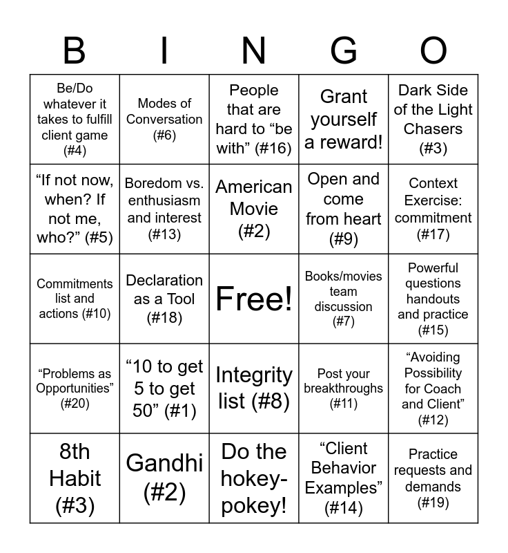 This bingo card has a free space and 24 words: “10 to get 5 to get 50” (#1), Gandhi (#2), American Movie (#2), 8th Habit (#3), Dark Side of the Light Chasers (#3), Be/Do whatever it takes to fulfill client game (#4), “If not now, when? If not me, who?” (#5), Modes of Conversation (#6), Books/movies team discussion (#7), Integrity list (#8), Open and come from heart (#9), Commitments list and actions (#10), Post your breakthroughs (#11), “Avoiding Possibility for Coach and Client” (#12), Boredom vs. enthusiasm and interest (#13), “Client Behavior Examples” (#14), Powerful questions handouts and practice (#15), People that are hard to “be with” (#16), Context Exercise: commitment (#17), Declaration as a Tool (#18), Practice requests and demands (#19), “Problems as Opportunities” (#20), Grant yourself a reward! and Do the hokey-pokey!.