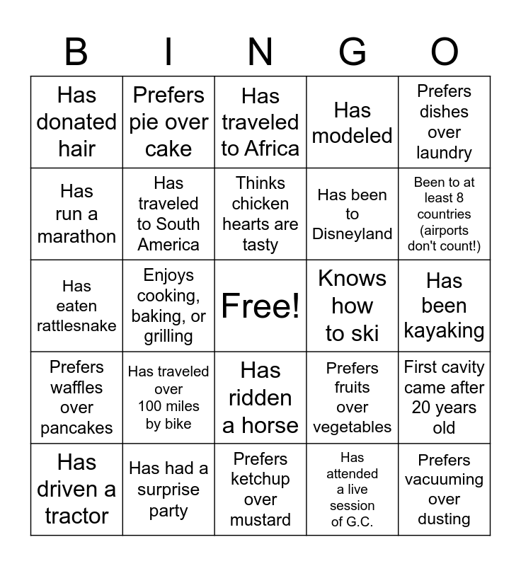 This bingo card has a free space and 79 words: Plays the clarinet, Has served a mission, Has traveled to Africa, Knows how to drive a manual, well, Has had an operation, Speaks Portuguese, Has performed in NYC, Has been on TV, Rode the London Eye, Has competed internationally, Has been pulled over by the police, Had braces, Has modeled, Has donated hair, Has donated blood, Has run a marathon, Has socks with animals on them, Has traveled over 100 miles by bike, Has been electro-cuted, Has been kayaking, Has scuba dived, Prefers dishes over laundry, Has eaten rattlesnake, Thinks chicken hearts are tasty, Has traveled to South America, Had their picture in the newspaper, Has been given a warning by the police, Featured in a calendar, Has served in at least 6 temples, Has been a competitive shooter, Been to at least 8 countries (airports don't count!), Attended a funeral at Arlington National Cemetery, Prefers ketchup over mustard, Has sailed a sailboat, Has driven a tractor, Knows how to ski, Owns a can opener, Plays the piano, Has gone ice skating, Prefers vacuuming over dusting, Has a royal toe, Has conducted a funeral, Performed an exorcisism, Has bathed a dog in a bath tub, Has a birthmark, Prefers pie over cake, Socks and sandals are okay together, Has known 1+ great- grandparents, Pineapple on pizza is yummy!, Allergic to some type of food, First cavity came after 20 years old, Enjoys cooking, baking, or grilling, Prefers fruits over vegetables, Dressed up for Halloween in the past 10 years, Has hunted - and succeeded, Used candles during a blackout, Has been in a car accident, Hiked 15+ hours straight, Has split wood, Has ridden a horse, Has been to Disneyland, Likes sushi, Orders food with 2+ stars (SPICY!), Has composed a song, Has written poetry, LOLWTIME for real, Stayed in a B&B, Touched jellyfish in the wild, Traveled by train, Prefers waffles over pancakes, Has had a surprise party, Has thrown a surprise party, Has won a game of Risk, Has snuck out of the house, Has been in an ambulance, Has attended a live session of G.C., Has been "cut - off", Hates the smell of coffee and Enjoys puzzles.