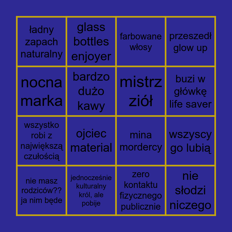 This bingo card has 16 words: jednocześnie kulturalny król, ale pobije, wszyscy go lubią, farbowane włosy, ładny zapach naturalny, wszystko robi z największą czułością, glass bottles enjoyer, mina mordercy, zero kontaktu fizycznego publicznie, nocna marka, bardzo dużo kawy, nie masz rodziców?? ja nim będe, przeszedł glow up, ojciec material, buzi w główkę life saver, mistrz ziół and nie słodzi niczego.