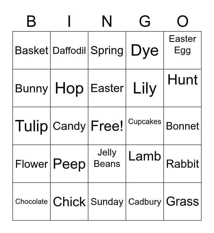 This bingo card has a free space and 24 words: Peep, Chick, Easter, Chocolate, Easter Egg, Basket, Bunny, Daffodil, Cupcakes, Jelly Beans, Lily, Tulip, Lamb, Rabbit, Hop, Cadbury, Bonnet, Spring, Hunt, Candy, Grass, Flower, Dye and Sunday.