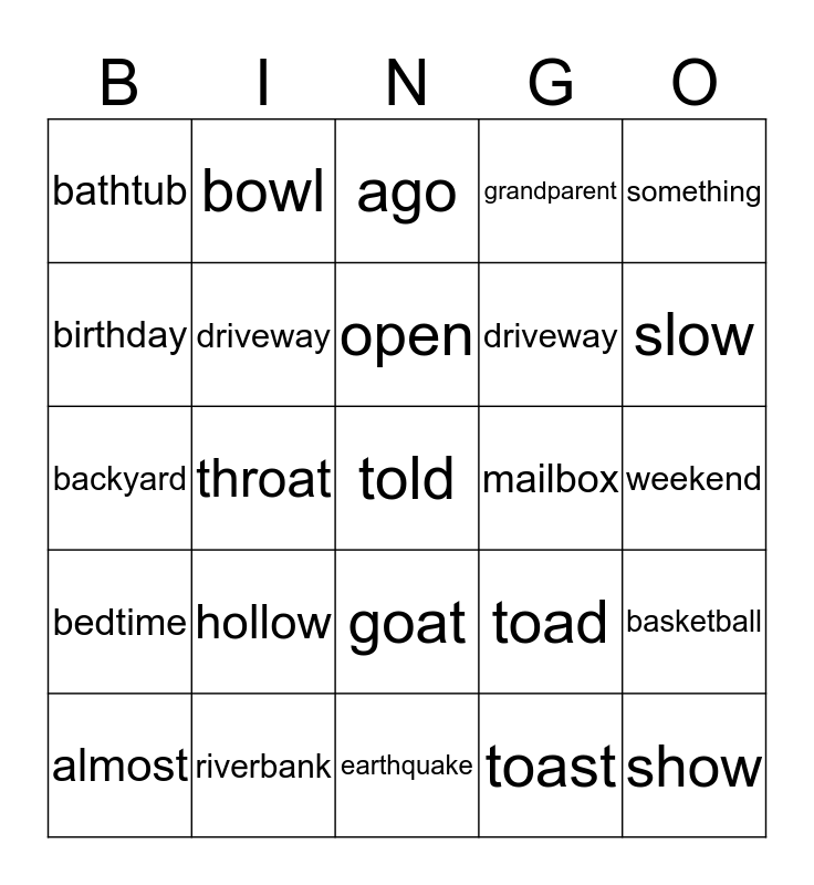 This bingo card has 31 words: earthquake, raindrop, throat, rattlesnake, bathtub, ago, driveway, toad, mailbox, toast, weekend, told, show, someone, slow, hold, basketball, hollow, bedtime, goat, something, float, almost, bowl, driveway, birthday, grandparent, backyard, riverbank, open and most.