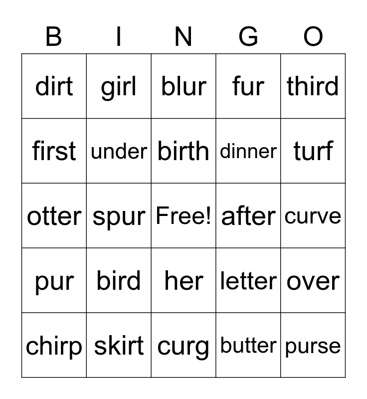 This bingo card has a free space and 24 words: bird, skirt, birth, chirp, third, dirt, first, girl, after, her, dinner, otter, letter, over, under, butter, curve, blur, turf, spur, purse, pur, fur and curg.