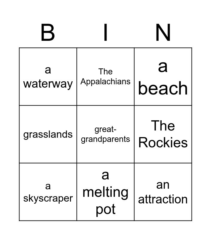 This bingo card has a free space and 8 words: The Rockies, a beach, The Appalachians, a skyscraper, a waterway, an attraction, grasslands and a melting pot.