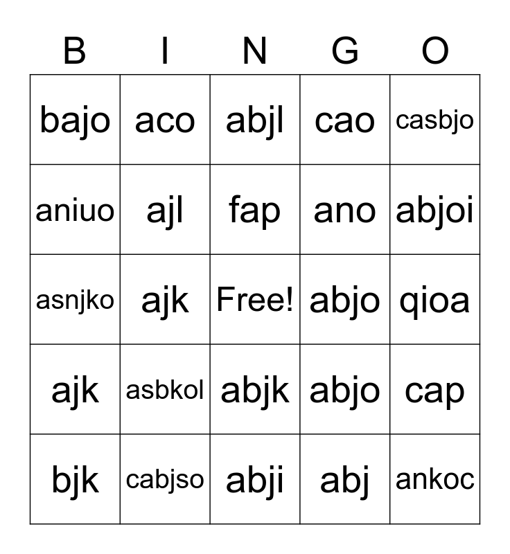 This bingo card has a free space and 29 words: bjk, afbwjia, ajk, jk, bajo, abjl, ajl, asbkol, abjo, cabjso, qioa, ankoc, abji, abj, abjoi, abjk, abjk, ajk, casbjo, asnjko, abjo, auioc, ano, aniuo, cao, aco, cap, fap and cao.