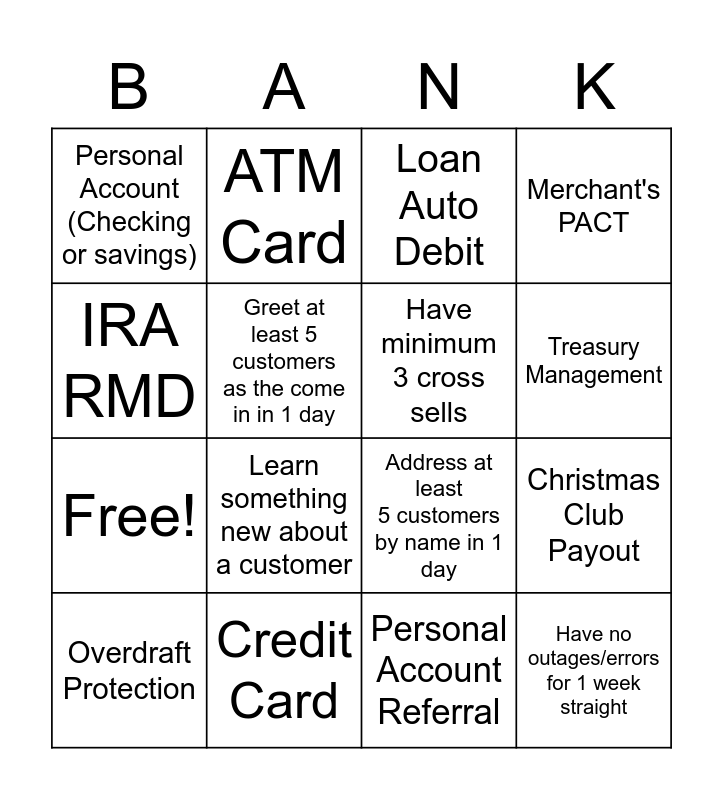 This bingo card has 20 words: Christmas Club Payout, Combined Statement, Loan Auto Debit, Opt In, Overdraft Protection, IRA RMD, Credit Card, Personal Account (Checking or savings), Free!, ATM Card, Learn something new about a customer, Address at least 5 customers by name in 1 day, Greet at least 5 customers as the come in in 1 day, Have no outages/errors for 1 week straight, Have minimum 3 cross sells, Receive a Fuel Card for Customer Service, Treasury Management, Merchant's PACT, Personal Account Referral and Loan Referral.