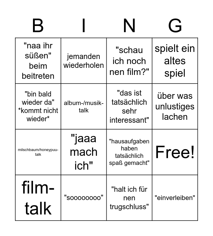 This bingo card has 20 words: Free!, "bin so müde heute", "schau ich noch nen film?", aufregen über die autistin, film-talk, "bin bald wieder da" *kommt nicht wieder*, "soooooooo", "naa ihr süßen" beim beitreten, milschbaum/honeypuu-talk, jemanden wiederholen, "jaaa mach ich", "hausaufgaben haben tatsächlich spaß gemacht", album-/musik-talk, "einverleiben", "das ist tatsächlich sehr interessant", "sone wichser", über was unlustiges lachen, spielt ein altes spiel, "halt ich für nen trugschluss" and ausrede.