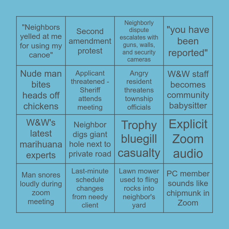 This bingo card has 24 words: Someone forgets to unmute Zoom, Controversial gravel mine applications, W&W staff becomes community babysitter, Portajon thrown in lake, Nude man bites heads off chickens, "Neighbors yelled at me for using my canoe", Applicant threatened - Sheriff attends meeting, Second amendment protest, Last-minute schedule changes from needy client, Urban Design Award!, W&W's latest marihuana experts, Trophy bluegill casualty, 445 pages of public comment, Forgetful client embarrasses PC at meeting, Angry resident threatens township officials, Project delayed because COVID is a hoax, Lawn mower used to fling rocks into neighbor's yard, Neighborly dispute escalates with guns, walls, and security cameras, Neighbor digs giant hole next to private road, Explicit Zoom audio, Man snores loudly during zoom meeting, PC member sounds like chipmunk in Zoom, "you have been reported" and Zoning Administrators treated like 24/7 Dell tech support.