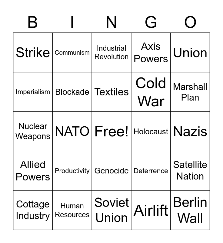 This bingo card has a free space and 24 words: Productivity, Human Resources, Textiles, Cottage Industry, Union, Strike, Imperialism, Communism, Holocaust, Genocide, Cold War, Nuclear Weapons, Deterrence, Satellite Nation, Blockade, Airlift, Nazis, Industrial Revolution, Marshall Plan, NATO, Berlin Wall, Allied Powers, Axis Powers and Soviet Union.