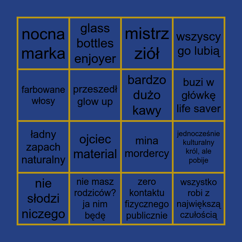 This bingo card has 16 words: nie masz rodziców? ja nim będę, jednocześnie kulturalny król, ale pobije, mistrz ziół, nocna marka, ładny zapach naturalny, glass bottles enjoyer, mina mordercy, zero kontaktu fizycznego publicznie, farbowane włosy, przeszedł glow up, nie słodzi niczego, wszyscy go lubią, ojciec material, buzi w główkę life saver, bardzo dużo kawy and wszystko robi z największą czułością.