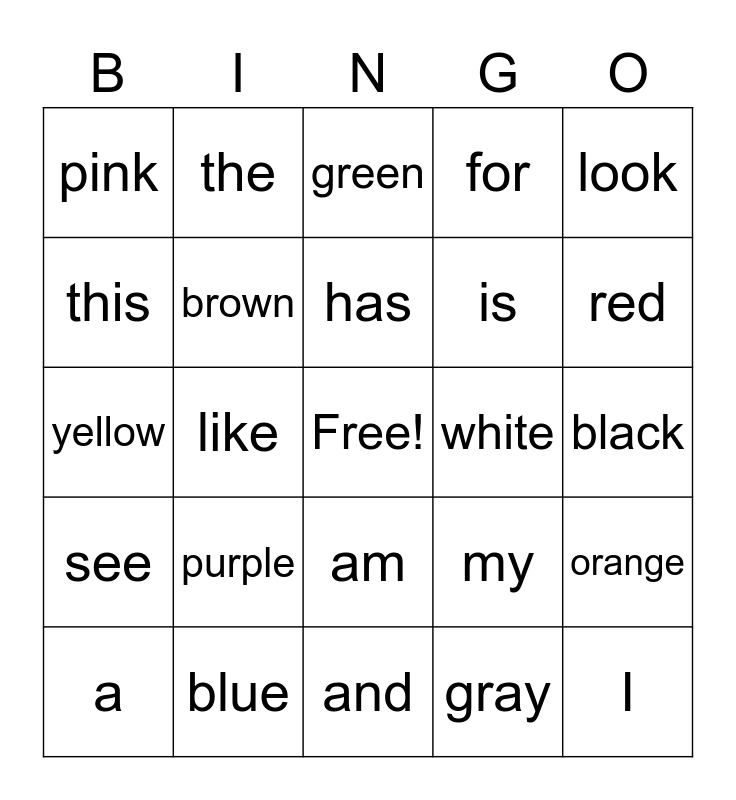 This bingo card has a free space and 24 words: a, purple, has, gray, look, pink, the, green, white, black, yellow, brown, my, orange, this, blue, and, for, red, see, like, am, is and I.