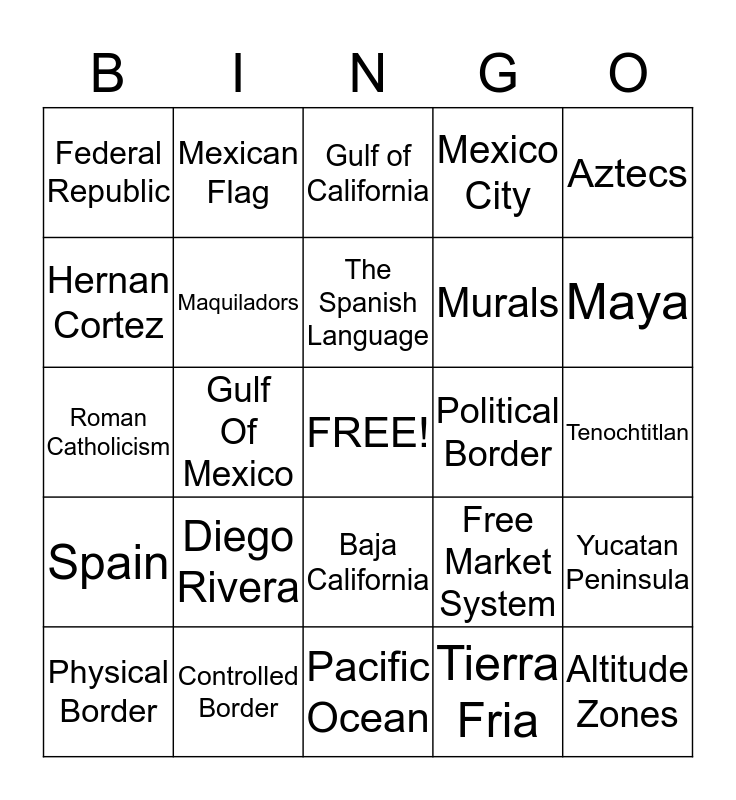 This bingo card has a free space and 24 words: Diego Rivera, Controlled Border, The Spanish Language, Physical Border, Aztecs, Federal Republic, Hernan Cortez, Mexican Flag, Political Border, Baja California, Murals, Roman Catholicism, Free Market System, Yucatan Peninsula, Maquiladors, Tierra Fria, Tenochtitlan, Gulf of California, Maya, Gulf Of Mexico, Altitude Zones, Spain, Mexico City and Pacific Ocean.