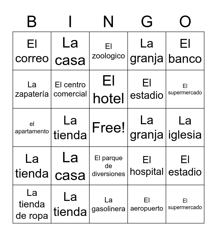 This bingo card has a free space and 309 words: El acuario, La escuela, La granja, El museo, La iglesia, El restaurante, La playa, La tienda de ropa, La casa/el apartamento, El supermercado, La panadería, La gasolinera, La biblioteca, El centro comercial, La piscina, El parque, El cine, El estadio, El hospital, La carnicería, El aeropuerto, La zapatería, El zoologico, El banco, La estacion de bomberos, El correo, El gimnasio, El hotel, El parque de diversiones, El cemetario, El acuario, La escuela, La granja, El museo, La iglesia, El restaurante, La playa, La tienda, La casa, el apartamento, El supermercado, La panadería, La gasolinera, La biblioteca, El centro comercial, La piscina, El parque- park, El cine, El estadio, El hospital, La carnicería, El aeropuerto, La zapatería, El zoologico, El banco, La estacion de bomberos, El correo, El gimnasio, El hotel, El parque de diversiones, El cemetario, El acuario, La escuela, La granja, El museo, La iglesia, El restaurante, La playa, La tienda, La casa, el apartamento, El supermercado, La panadería, La gasolinera, La biblioteca, El centro comercial, La piscina, El parque- park, El cine, El estadio, El hospital, La carnicería, El aeropuerto, La zapatería, El zoologico, El banco, La estacion de bomberos, El correo, El gimnasio, El hotel, El parque de diversiones, El cemetario, El acuario, La escuela, La granja, El museo, La iglesia, El restaurante, La playa, La tienda, La casa, el apartamento, El supermercado, La panadería, La gasolinera, La biblioteca, El centro comercial, La piscina, El parque- park, El cine, El estadio, El hospital, La carnicería, El aeropuerto, La zapatería, El zoologico, El banco, La estacion de bomberos, El correo, El gimnasio, El hotel, El parque de diversiones, El cemetario, El acuario, La escuela, La granja, El museo, La iglesia, El restaurante, La playa, La tienda, La casa, el apartamento, El supermercado, La panadería, La gasolinera, La biblioteca, El centro comercial, La piscina, El parque- park, El cine, El estadio, El hospital, La carnicería, El aeropuerto, La zapatería, El zoologico, El banco, La estacion de bomberos, El correo, El gimnasio, El hotel, El parque de diversiones, El cemetario, El acuario, La escuela, La granja, El museo, La iglesia, El restaurante, La playa, La tienda, La casa, el apartamento, El supermercado, La panadería, La gasolinera, La biblioteca, El centro comercial, La piscina, El parque- park, El cine, El estadio, El hospital, La carnicería, El aeropuerto, La zapatería, El zoologico, El banco, La estacion de bomberos, El correo, El gimnasio, El hotel, El parque de diversiones, El cemetario, El acuario, La escuela, La granja, El museo, La iglesia, El restaurante, La playa, La tienda, La casa, el apartamento, El supermercado, La panadería, La gasolinera, La biblioteca, El centro comercial, La piscina, El parque- park, El cine, El estadio, El hospital, La carnicería, El aeropuerto, La zapatería, El zoologico, El banco, La estacion de bomberos, El correo, El gimnasio, El hotel, El parque de diversiones, El cemetario, El acuario, La escuela, La granja, El museo, La iglesia, El restaurante, La playa, La tienda, La casa, el apartamento, El supermercado, La panadería, La gasolinera, La biblioteca, El centro comercial, La piscina, El parque- park, El cine, El estadio, El hospital, La carnicería, El aeropuerto, La zapatería, El zoologico, El banco, La estacion de bomberos, El correo, El gimnasio, El hotel, El parque de diversiones, El cemetario, El acuario, La escuela, La granja, El museo, La iglesia, El restaurante, La playa, La tienda, La casa, el apartamento, El supermercado, La panadería, La gasolinera, La biblioteca, El centro comercial, La piscina, El parque- park, El cine, El estadio, El hospital, La carnicería, El aeropuerto, La zapatería, El zoologico, El banco, La estacion de bomberos, El correo, El gimnasio, El hotel, El parque de diversiones, El cemetario, El acuario, La escuela, La granja, El museo, La iglesia, El restaurante, La playa, La tienda, La casa, el apartamento, El supermercado, La panadería, La gasolinera, La biblioteca, El centro comercial, La piscina, El parque, El cine, El estadio, El hospital, La carnicería, El aeropuerto, La zapatería, El zoologico, El banco, La estacion de bomberos, El correo, El gimnasio, El hotel, El parque de diversiones and El cemetario.