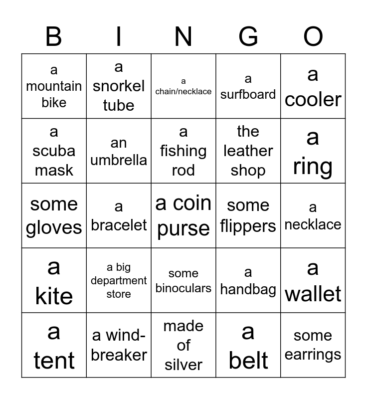 This bingo card has a free space and 24 words: a big department store, a wind-breaker, a fishing rod, a tent, a cooler, a mountain bike, a scuba mask, a snorkel tube, some flippers, some binoculars, the leather shop, some gloves, a handbag, a wallet, an umbrella, a belt, a necklace, a chain/necklace, a ring, a bracelet, some earrings, a kite, a surfboard and made of silver.
