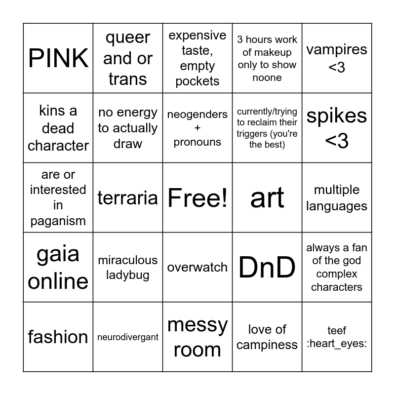 This bingo card has a free space and 24 words: fashion, miraculous ladybug, neogenders + pronouns, love of campiness, vampires <3, PINK, queer and or trans, expensive taste, empty pockets, art, multiple languages, are or interested in paganism, no energy to actually draw, DnD, always a fan of the god complex characters, kins a dead character, neurodivergant, messy room, 3 hours work of makeup only to show noone, spikes <3, gaia online, terraria, overwatch, currently/trying to reclaim their triggers (you're the best) and teef :heart_eyes:.