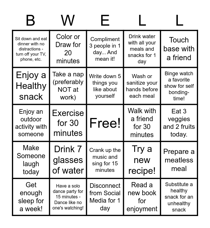 This bingo card has a free space and 24 words: Drink 7 glasses of water, Have a solo dance party for 15 minutes - Dance like no one's watching!, Write down 5 things you like about yourself, Get enough sleep for a week!, Touch base with a friend, Sit down and eat dinner with no distractions - turn off your TV, phone, etc., Enjoy a Healthy snack, Color or Draw for 20 minutes, Walk with a friend for 30 minutes, Crank up the music and sing for 15 minutes, Wash or sanitize your hands before each meal, Enjoy an outdoor activity with someone, Try a new recipe!, Prepare a meatless meal, Take a nap (preferably NOT at work), Read a new book for enjoyment, Eat 3 veggies and 2 fruits today., Compliment 3 people in 1 day... And mean it!, Binge watch a favorite show for self bonding-time!, Exercise for 30 minutes, Substitute a healthy snack for an unhealthy snack, Make Someone laugh today, Drink water with all your meals and snacks for 1 day and Disconnect from Social Media for 1 day.