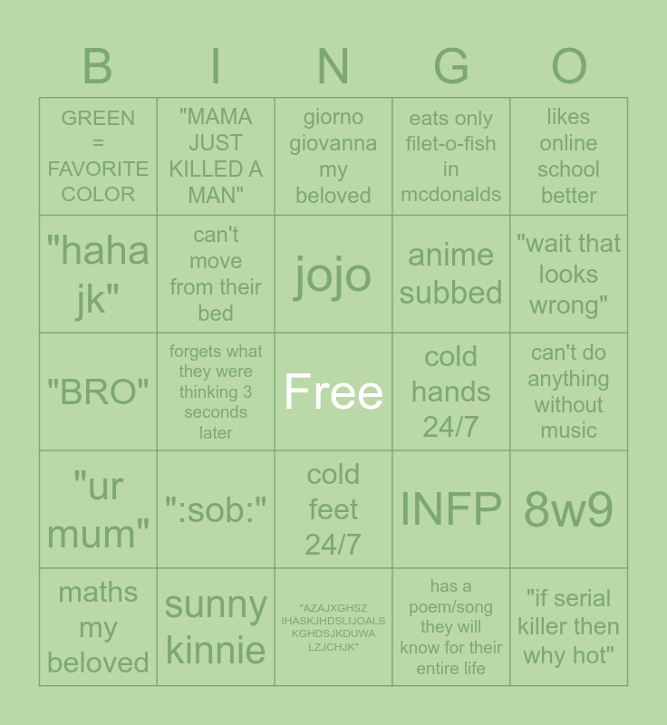 This bingo card has a free space and 24 words: ":sob:", sunny kinnie, jojo, maths my beloved, likes online school better, GREEN = FAVORITE COLOR, "haha jk", "MAMA JUST KILLED A MAN", cold hands 24/7, cold feet 24/7, anime subbed, "BRO", INFP, 8w9, can't move from their bed, has a poem/song they will know for their entire life, can't do anything without music, giorno giovanna my beloved, "wait that looks wrong", forgets what they were thinking 3 seconds later, "if serial killer then why hot", "ur mum", eats only filet-o-fish in mcdonalds and "AZAJXGHSZ IHASKJHDSLIJOALS KGHDSJKDUWA LZJCHJK".