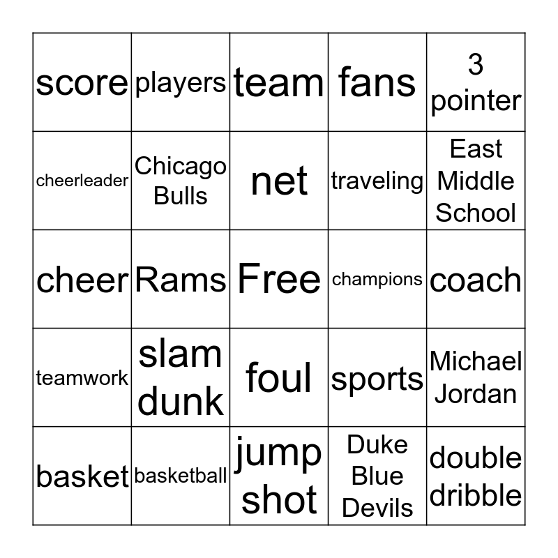 This bingo card has a free space and 24 words: slam dunk, basketball, net, basket, 3 pointer, score, cheerleader, players, champions, foul, traveling, cheer, sports, Michael Jordan, Chicago Bulls, Duke Blue Devils, coach, team, East Middle School, Rams, double dribble, teamwork, fans and jump shot.