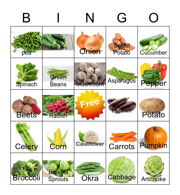 This bingo card has 24 images, a free space and 24 words: Corn, Brussel Sprouts, Mushroom, Broccoli, Cucumber, pea, Spinach, Zucchini, Egg Plant, Cauliflower, Asparagus, Beets, Carrots, Pumpkin, Green Beans, Cabbage, Potato, Onion, Pepper, Radish, Artichoke, Celery, Sweet Potato and Okra.