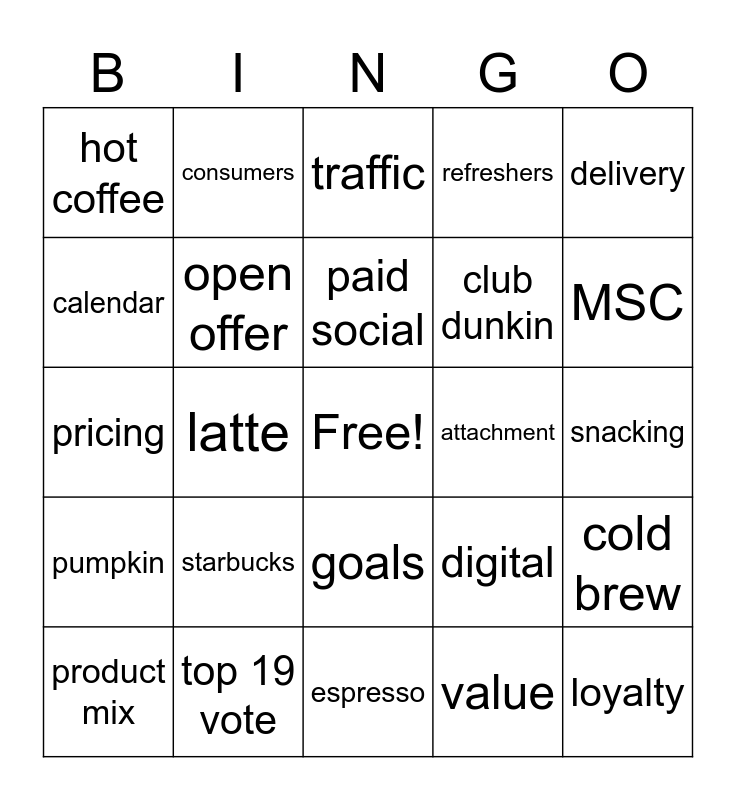 This bingo card has a free space and 24 words: starbucks, top 19 vote, paid social, product mix, delivery, hot coffee, calendar, consumers, attachment, goals, club dunkin, pricing, digital, cold brew, open offer, value, snacking, traffic, MSC, latte, loyalty, pumpkin, refreshers and espresso.