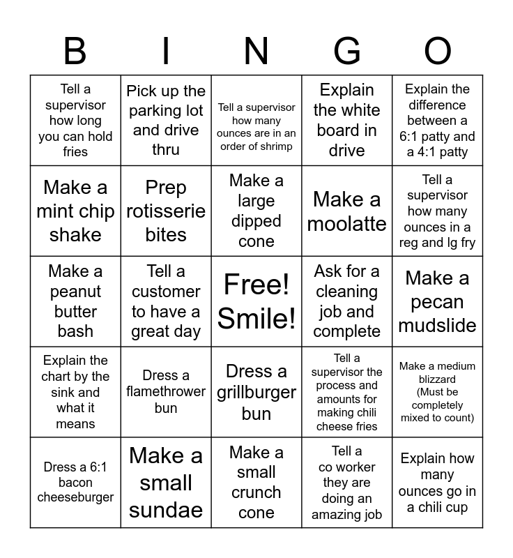 This bingo card has a free space and 24 words: Dress a flamethrower bun, Make a small sundae, Make a large dipped cone, Dress a 6:1 bacon cheeseburger, Explain the difference between a 6:1 patty and a 4:1 patty, Tell a supervisor how long you can hold fries, Make a mint chip shake, Pick up the parking lot and drive thru, Ask for a cleaning job and complete, Dress a grillburger bun, Make a moolatte, Make a peanut butter bash, Tell a supervisor the process and amounts for making chili cheese fries, Make a medium blizzard (Must be completely mixed to count), Prep rotisserie bites, Tell a co worker they are doing an amazing job, Make a pecan mudslide, Tell a supervisor how many ounces are in an order of shrimp, Tell a supervisor how many ounces in a reg and lg fry, Tell a customer to have a great day, Explain how many ounces go in a chili cup, Explain the chart by the sink and what it means, Explain the white board in drive and Make a small crunch cone.