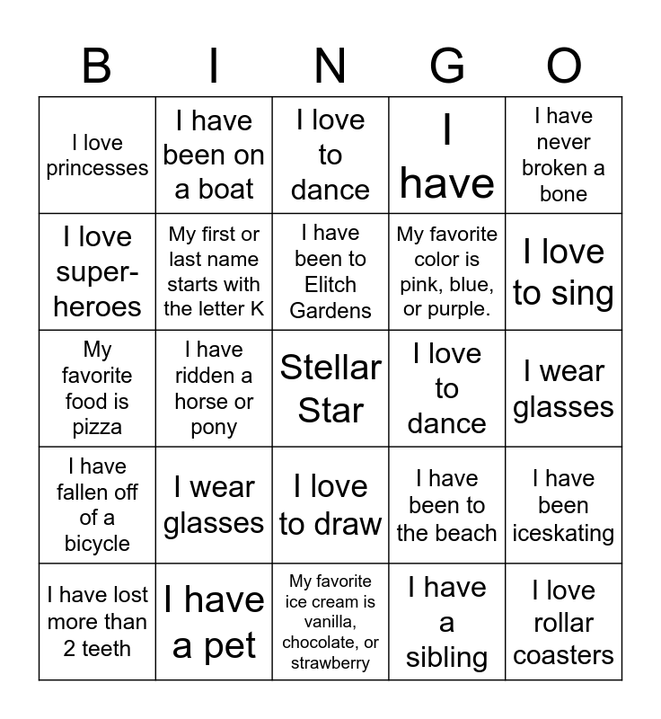 This bingo card has a free space and 24 words: I wear glasses, I have a pet, I have been to Elitch Gardens, I have lost more than 2 teeth, I have never broken a bone, I love princesses, I love super-heroes, I have been on a boat, I love to dance, I love to draw, My favorite color is pink, blue, or purple., My favorite food is pizza, I have been to the beach, I have been iceskating, My first or last name starts with the letter K, I have a sibling, I wear glasses, I love to dance, I love to sing, I have ridden a horse or pony, I love rollar coasters, I have fallen off of a bicycle, I have and My favorite ice cream is vanilla, chocolate, or strawberry.