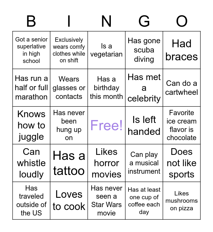 This bingo card has a free space and 24 words: Has a tattoo, Loves to cook, Has a birthday this month, Has traveled outside of the US, Had braces, Got a senior superlative in high school, Has run a half or full marathon, Exclusively wears comfy clothes while on shift, Is left handed, Likes horror movies, Has met a celebrity, Knows how to juggle, Can play a musical instrument, Does not like sports, Wears glasses or contacts, Has at least one cup of coffee each day, Favorite ice cream flavor is chocolate, Is a vegetarian, Can do a cartwheel, Has never been hung up on, Likes mushrooms on pizza, Can whistle loudly, Has gone scuba diving and Has never seen a Star Wars movie.