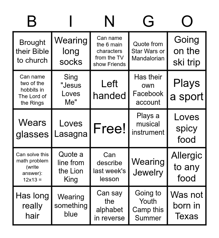 This bingo card has a free space and 24 words: Quote a line from the Lion King, Wearing something blue, Left handed, Has long really hair, Going on the ski trip, Brought their Bible to church, Can name two of the hobbits in The Lord of the Rings, Wearing long socks, Plays a musical instrument, Can describe last week's lesson, Has their own Facebook account, Wears glasses, Wearing Jewelry, Allergic to any food, Sing "Jesus Loves Me", Going to Youth Camp this Summer, Loves spicy food, Can name the 6 main characters from the TV show Friends, Plays a sport, Loves Lasagna, Was not born in Texas, Can solve this math problem (write answer): 12x13 =, Quote from Star Wars or Mandalorian and Can say the alphabet in reverse.