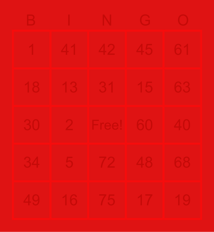 This bingo card has a free space and 24 words: 5, 16, 31, 49, 61, 1, 18, 41, 60, 72, 15, 30, 48, 68, 13, 17, 40, 42, 63, 2, 19, 34, 45 and 75.