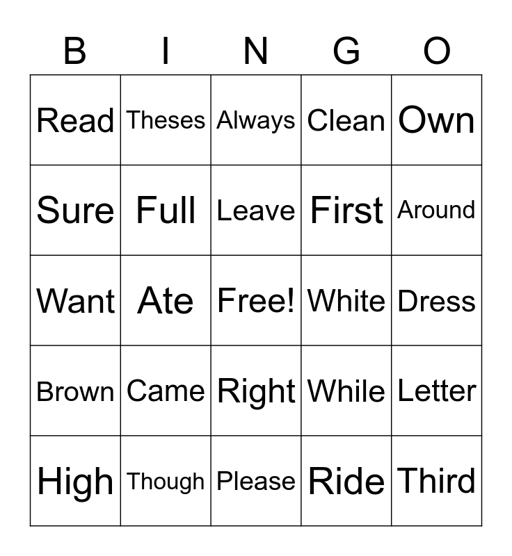 This bingo card has a free space and 25 words: Came, Please, Leave, High, Own, Read, Sure, Theses, White, Right, First, Want, While, Letter, Full, Gave, Dress, Always, Around, Ate, Third, Though, Brown, Clean and Ride.