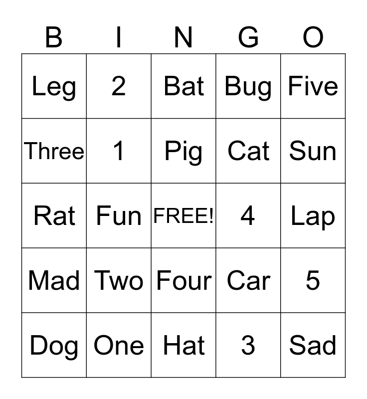 This bingo card has a free space and 24 words: Two, One, Pig, Dog, Five, Leg, Three, 2, 4, Four, Cat, Rat, Car, 5, 1, 3, Lap, Bat, Sun, Fun, Sad, Mad, Bug and Hat.