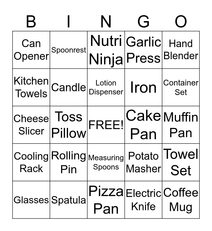 This bingo card has a free space and 44 words: Platter, Coffee Mug, Dinner Plate, Glasses, Saucepan, Electric Knife, Nutri Ninja, Coffee Maker, Hand Blender, Spatula, Garlic Press, Cake Pan, Measuring Spoons, Rolling Pin, Bread Loaf Pan, Pizza Pan, Pizza Wheel, Cheese Slicer, Ice Cube Tray, Container Set, Spoonrest, Cutting Board, Ice Cream Scoop, Can Opener, Cookie Sheet, Muffin Pan, Meat Thermometer, Spice Rack, Potato Masher, Cooling Rack, Salad Spinner, Towel Set, Sheet Set, Knives, Toss Pillow, Throw Blanket, Duvet Cover, Toothbrush Holder, Lotion Dispenser, Kitchen Towels, Iron, Ironing Board, Candle and Picture Frame.