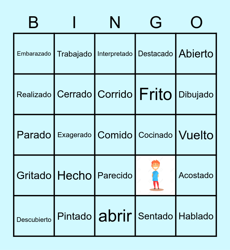 This bingo card has 1 images and 24 words: Hecho, abrir, Corrido, Descubierto, Abierto, Embarazado, Realizado, Trabajado, Cocinado, Parecido, Frito, Parado, Acostado, Cerrado, Hablado, Vuelto, Interpretado, Dibujado, Exagerado, Comido, Pintado, Gritado, Destacado and Sentado.
