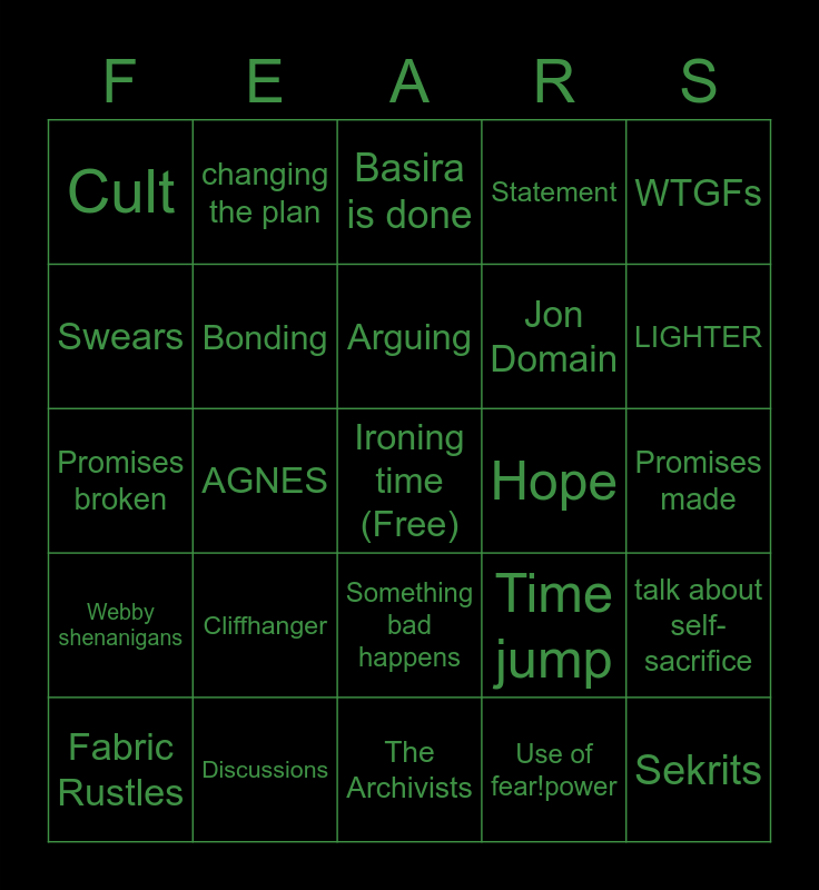 This bingo card has a free space and 24 words: Cliffhanger, Discussions, Arguing, Fabric Rustles, WTGFs, Cult, Swears, changing the plan, Hope, Something bad happens, Jon Domain, Promises broken, Time jump, talk about self-sacrifice, Bonding, Use of fear!power, Promises made, Basira is done, LIGHTER, AGNES, Sekrits, Webby shenanigans, Statement and The Archivists.