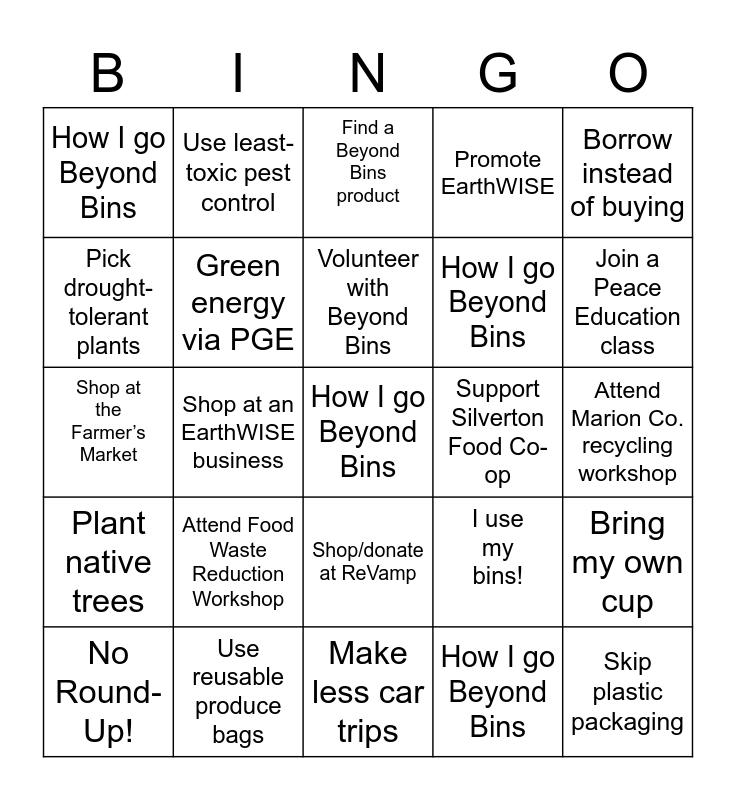 This bingo card has 25 words: Attend Food Waste Reduction Workshop, Make less car trips, Volunteer with Beyond Bins, No Round-Up!, Borrow instead of buying, How I go Beyond Bins, Pick drought-tolerant plants, Use least-toxic pest control, Support Silverton Food Co-op, Shop/donate at ReVamp, How I go Beyond Bins, Shop at the Farmer’s Market, I use my bins!, Bring my own cup, Green energy via PGE, Skip plastic packaging, Attend Marion Co. recycling workshop, Find a Beyond Bins product, Join a Peace Education class, Shop at an EarthWISE business, How I go Beyond Bins, Use reusable produce bags, Plant native trees, Promote EarthWISE and How I go Beyond Bins.