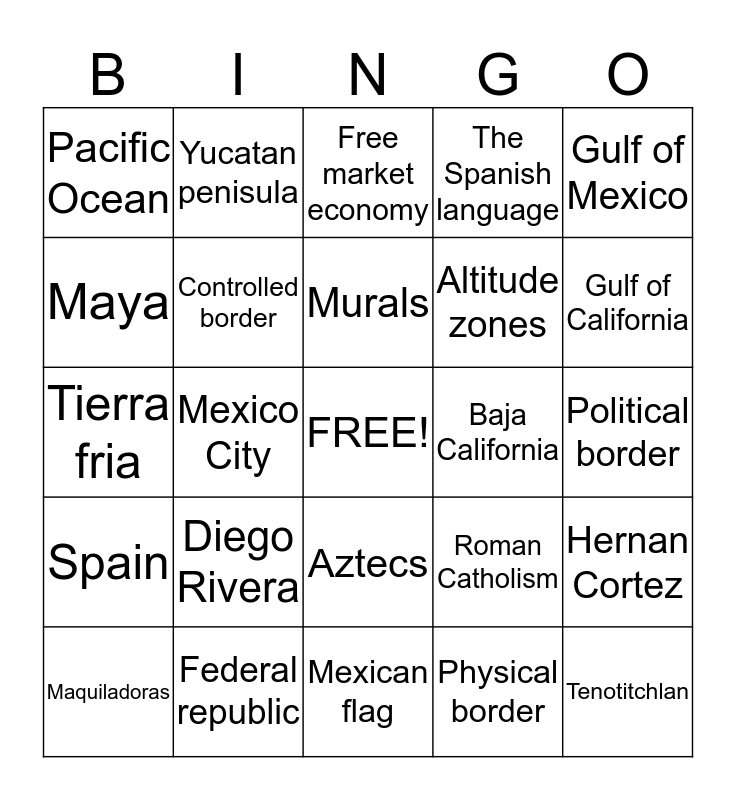This bingo card has a free space and 24 words: Diego Rivera, Federal republic, Murals, Maquiladoras, Gulf of Mexico, Pacific Ocean, Maya, Yucatan penisula, Baja California, Aztecs, Altitude zones, Tierra fria, Roman Catholism, Hernan Cortez, Controlled border, Physical border, Political border, Free market economy, Gulf of California, Mexico City, Tenotitchlan, Spain, The Spanish language and Mexican flag.