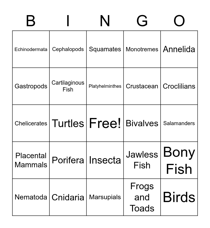 This bingo card has a free space and 24 words: Porifera, Cnidaria, Platyhelminthes, Nematoda, Annelida, Echinodermata, Gastropods, Cephalopods, Bivalves, Insecta, Crustacean, Chelicerates, Jawless Fish, Bony Fish, Cartilaginous Fish, Frogs and Toads, Salamanders, Squamates, Croclilians, Turtles, Birds, Placental Mammals, Monotremes and Marsupials.