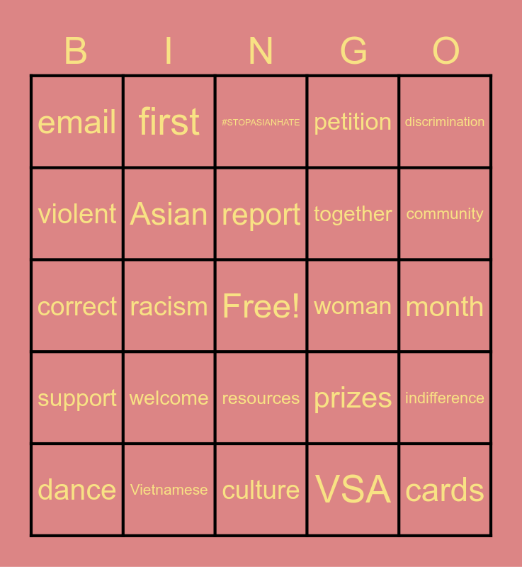 This bingo card has a free space and 24 words: welcome, Vietnamese, report, dance, discrimination, email, violent, first, woman, resources, together, correct, prizes, indifference, Asian, VSA, month, #STOPASIANHATE, community, racism, cards, support, petition and culture.