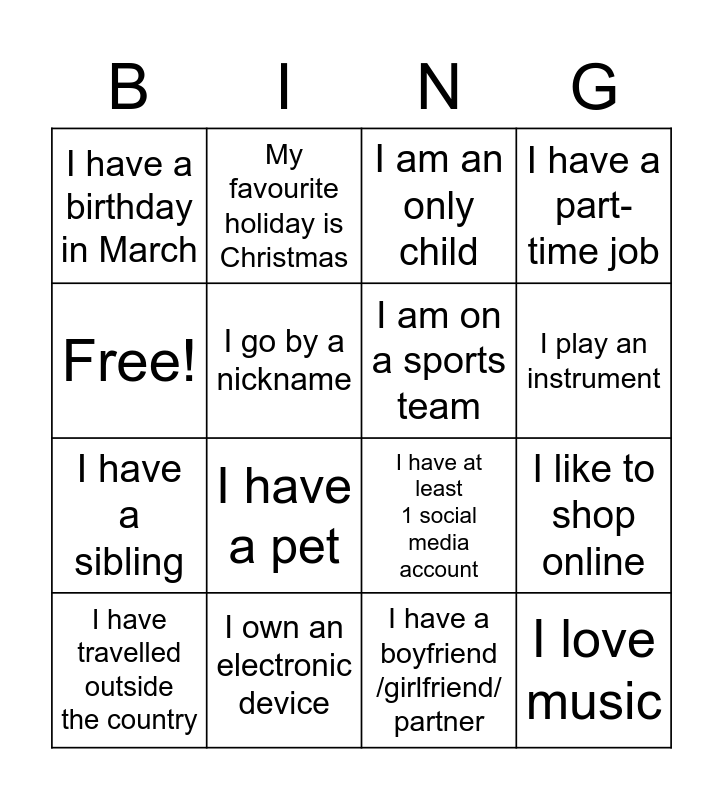 This bingo card has 16 words: I own an electronic device, I like to shop online, I am an only child, I have a birthday in March, I have a sibling, My favourite holiday is Christmas, I have at least 1 social media account, I have a boyfriend /girlfriend/ partner, Free!, I go by a nickname, I have travelled outside the country, I have a part-time job, I have a pet, I play an instrument, I am on a sports team and I love music.