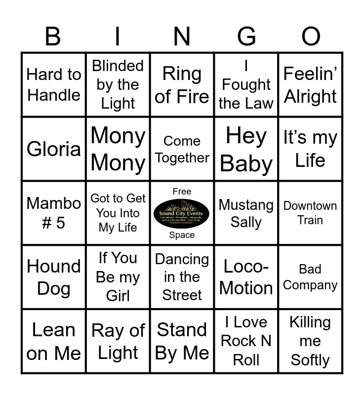 This bingo card has a free space and 67 words: I want Candy, All Along The Watchtower, Always Something There to Remind Me, Bad Company, Venus, Big Yellow Taxi, Blinded by the Light, Boy From NY City, Come Together, Cruel Summer, Dancing in the Street, Don’t Cha, Downtown Train, Feelin’ Alright, Girls Just Wanna Have Fun, Gloria, Got to Get You Into My Life, Hard to Handle, Havin’ a Party, Hey Baby, If You Be my Girl, Hound Dog, I Fought the Law, I Love Rock N Roll, I Love You Always Forever, I’m a Believer, In the Midnight Hour, Into the Groove, It’s my Life, Jolene, Killing me Softly, Lady Marmalade, Land of a Thousand Dances, Landslide, Last kiss, Lean on Me, Live and Let Die, Loco-Motion, Mambo # 5, Mickey, Mockingbird, Mony Mony, Mustang Sally, My Maria, Picture, Pretty Woman, Proud Mary, Ray of Light, Red Red Wine, Respect, Ring of Fire, Rockin’ Robin, Smokin in the Boys Room, Some Kind of Wonderful, Soul Man, Stand By Me, Tainted Love, Take it Easy, That’s the way Love Goes, Time is on My Side, Turn Turn Turn, Twist and Shout, Valerie, Walk This Way, Wild Night, With a Little Help From my Friends and You Really Got Me.
