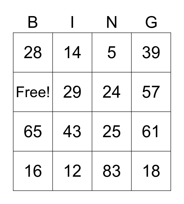 This bingo card has 16 words: 12, 61, 5, 28, 65, 14, 25, 83, Free!, 29, 16, 39, 43, 57, 24 and 18.