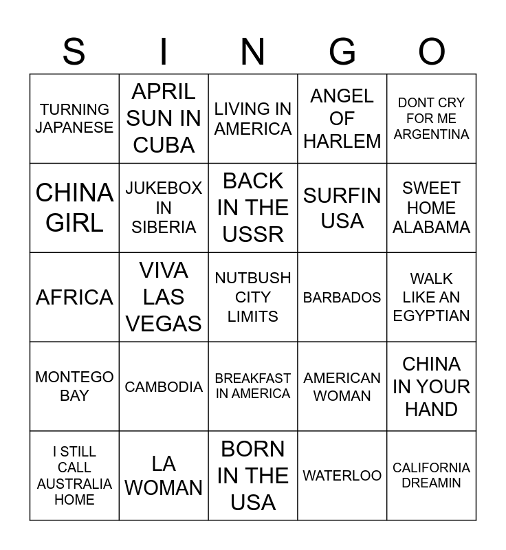 This bingo card has 25 words: CAMBODIA, BORN IN THE USA, BACK IN THE USSR, I STILL CALL AUSTRALIA HOME, DONT CRY FOR ME ARGENTINA, TURNING JAPANESE, CHINA GIRL, APRIL SUN IN CUBA, BARBADOS, BREAKFAST IN AMERICA, SURFIN USA, AFRICA, AMERICAN WOMAN, CHINA IN YOUR HAND, JUKEBOX IN SIBERIA, CALIFORNIA DREAMIN, WALK LIKE AN EGYPTIAN, LIVING IN AMERICA, SWEET HOME ALABAMA, VIVA LAS VEGAS, NUTBUSH CITY LIMITS, LA WOMAN, MONTEGO BAY, ANGEL OF HARLEM and WATERLOO.
