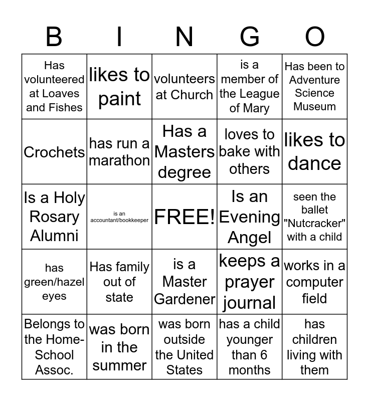 This bingo card has a free space and 24 words: Has family out of state, was born in the summer, Has a Masters degree, Belongs to the Home-School Assoc., Has been to Adventure Science Museum, Has volunteered at Loaves and Fishes, Crochets, likes to paint, Is an Evening Angel, is a Master Gardener, loves to bake with others, Is a Holy Rosary Alumni, keeps a prayer journal, works in a computer field, has run a marathon, has a child younger than 6 months, seen the ballet "Nutcracker" with a child, volunteers at Church, likes to dance, is an accountant/bookkeeper, has children living with them, has green/hazel eyes, is a member of the League of Mary and was born outside the United States.
