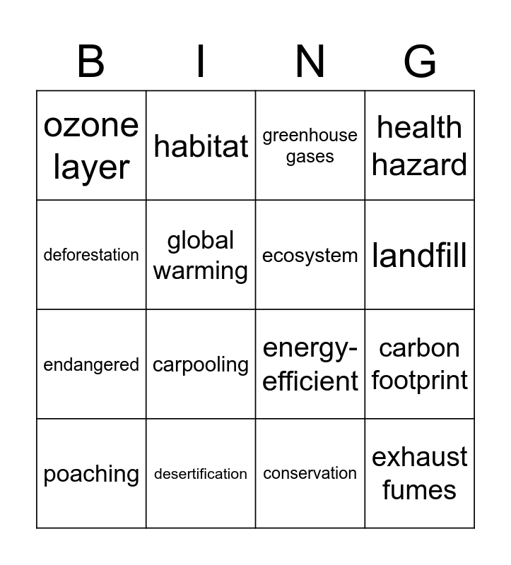 This bingo card has 16 words: desertification, carbon footprint, greenhouse gases, ozone layer, endangered, habitat, energy-efficient, conservation, deforestation, global warming, poaching, health hazard, carpooling, landfill, ecosystem and exhaust fumes.