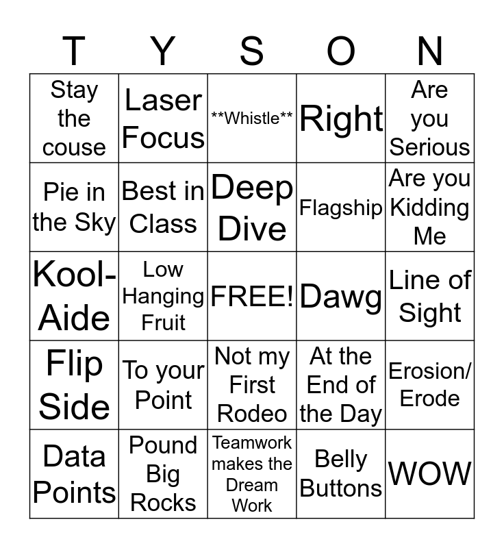 This bingo card has a free space and 24 words: To your Point, Pound Big Rocks, Deep Dive, Data Points, Are you Serious, Stay the couse, Pie in the Sky, Laser Focus, Dawg, Not my First Rodeo, Flagship, Kool-Aide, At the End of the Day, Erosion/ Erode, Best in Class, Belly Buttons, Line of Sight, **Whistle**, Are you Kidding Me, Low Hanging Fruit, WOW, Flip Side, Right and Teamwork makes the Dream Work.