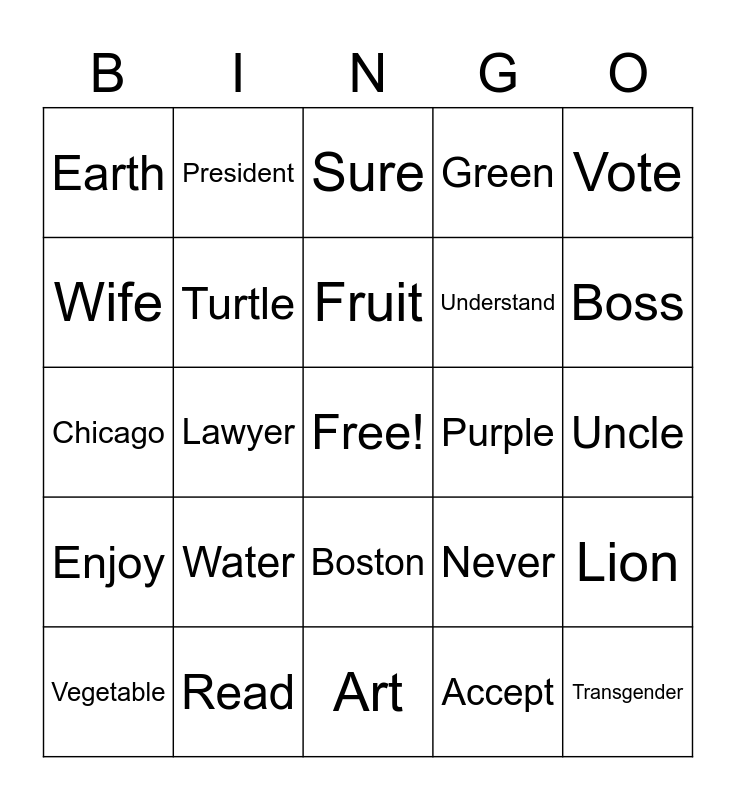 This bingo card has a free space and 24 words: Water, Read, Fruit, Vegetable, Vote, Earth, Wife, President, Purple, Boston, Understand, Chicago, Never, Lion, Turtle, Accept, Uncle, Sure, Boss, Lawyer, Transgender, Enjoy, Green and Art.