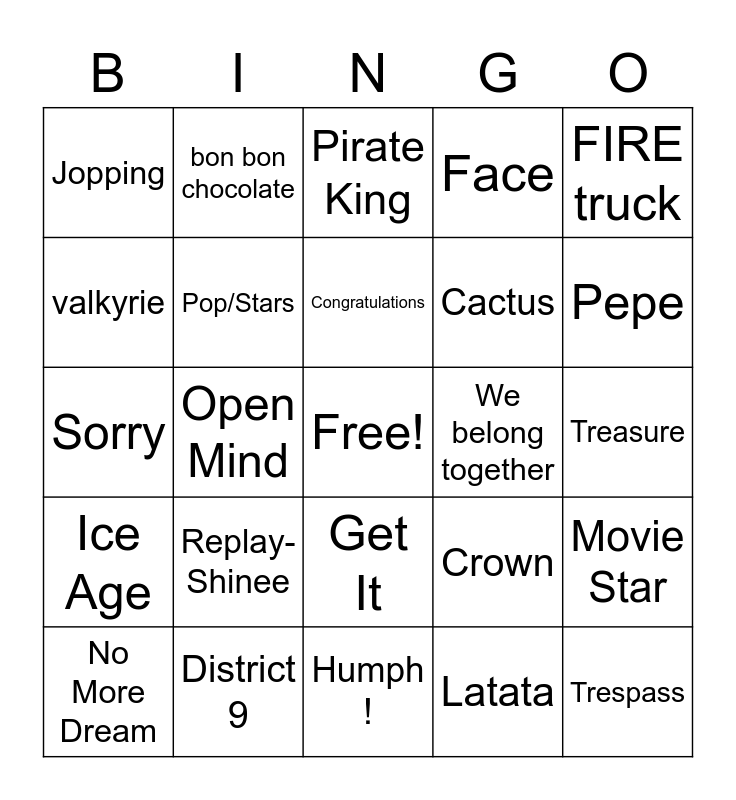 This bingo card has a free space and 24 words: Replay-Shinee, District 9, Congratulations, No More Dream, FIRE truck, Jopping, valkyrie, bon bon chocolate, We belong together, Get It, Cactus, Sorry, Crown, Movie Star, Pop/Stars, Latata, Treasure, Pirate King, Pepe, Open Mind, Trespass, Ice Age, Face and Humph !.