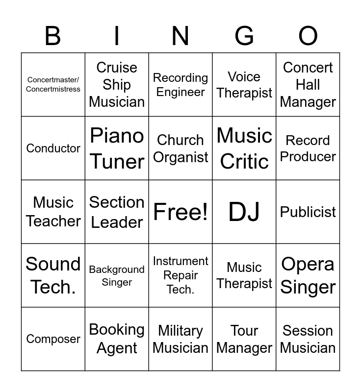 This bingo card has a free space and 24 words: Background Singer, Booking Agent, Church Organist, Composer, Concert Hall Manager, Concertmaster/ Concertmistress, Conductor, Cruise Ship Musician, DJ, Instrument Repair Tech., Music Critic, Music Teacher, Music Therapist, Opera Singer, Piano Tuner, Tour Manager, Publicist, Recording Engineer, Record Producer, Section Leader, Session Musician, Sound Tech., Voice Therapist and Military Musician.