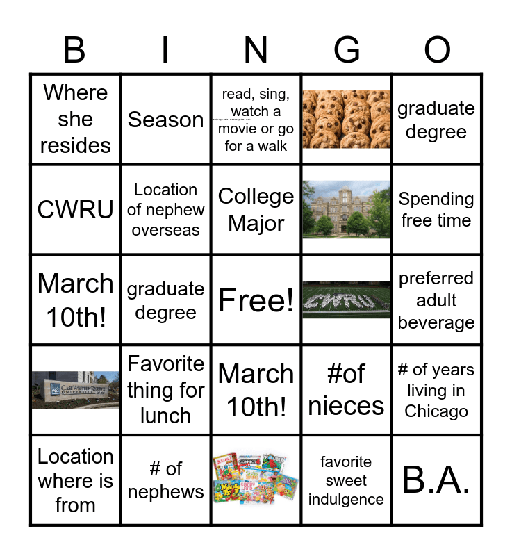 This bingo card has 6 images, a free space and 19 words: Favorite thing for lunch, # of nephews, College Major, Location where is from, graduate degree, Where she resides, CWRU, Season, March 10th!, March 10th!, #of nieces, # of years living in Chicago, Location of nephew overseas, favorite sweet indulgence, preferred adult beverage, read, sing, watch a movie or go for a walk, Spending free time, graduate degree and B.A..