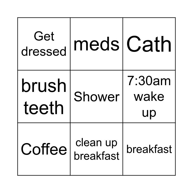 This bingo card has a free space and 8 words: 7:30am wake up, Cath, meds, Coffee, Get dressed, breakfast, brush teeth and clean up breakfast.